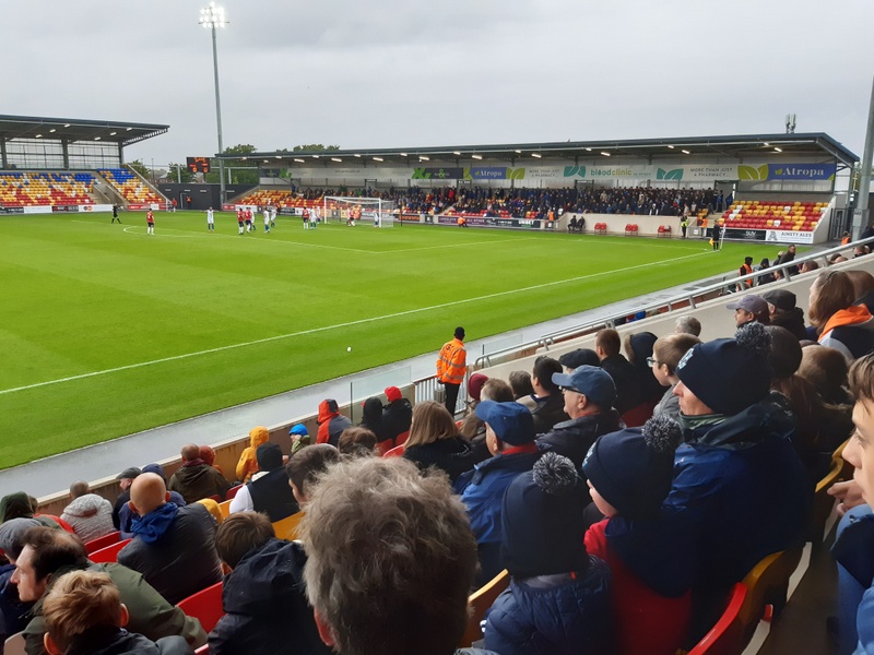With kick-off approaching we braved the rain and took a bus to the Community Stadium. It took about half an hour which is longer than the timetable suggested but there seemed to be plenty of buses. I’d bought our twelve quid tickets online and the bar codes on my phone weren’t recognized at the turnstiles. A friendly steward used his own code and let us in anyway.