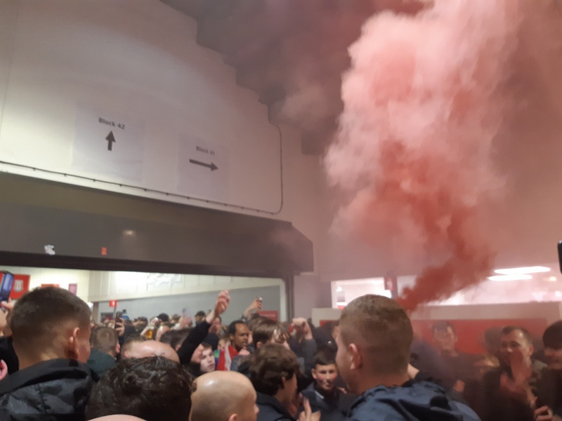 The taxi dropped me close to the ground and after initially heading for the wrong turnstiles and then a quick body search outside the correct ones I was soon inside. The concourse area was far too small for the amount of fans that we had brought and it was a squeeze to move around. I eventually jostled my way to the bar for a final pre-match drink. It didn’t seem wise to try and carry a pint so I opted for a bottle of cider but still had to put my thumb over the opening as young lads around me bounced up and down.