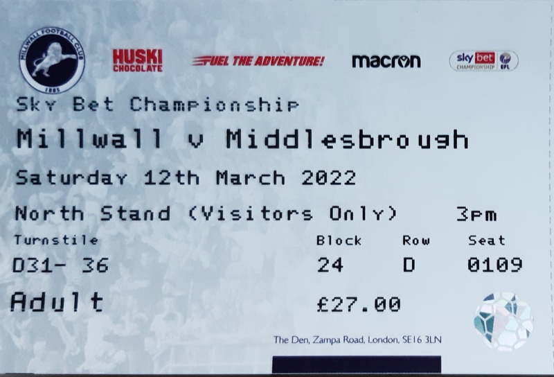 At the start of this season, I still had four of the current Championship grounds to tick off with a first visit. One of them was Millwall’s New Den, or as it is now getting on for thirty years old, just The Den again. Harry was busy with a rugby tournament, so I only needed the one ticket which I was able to get fairly easily.