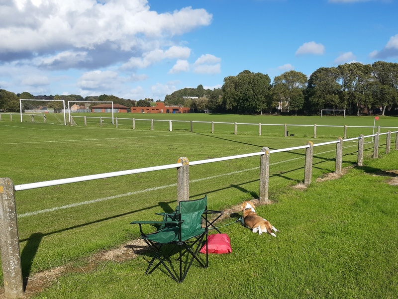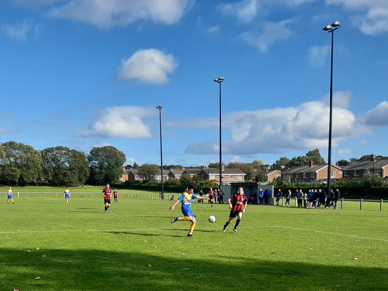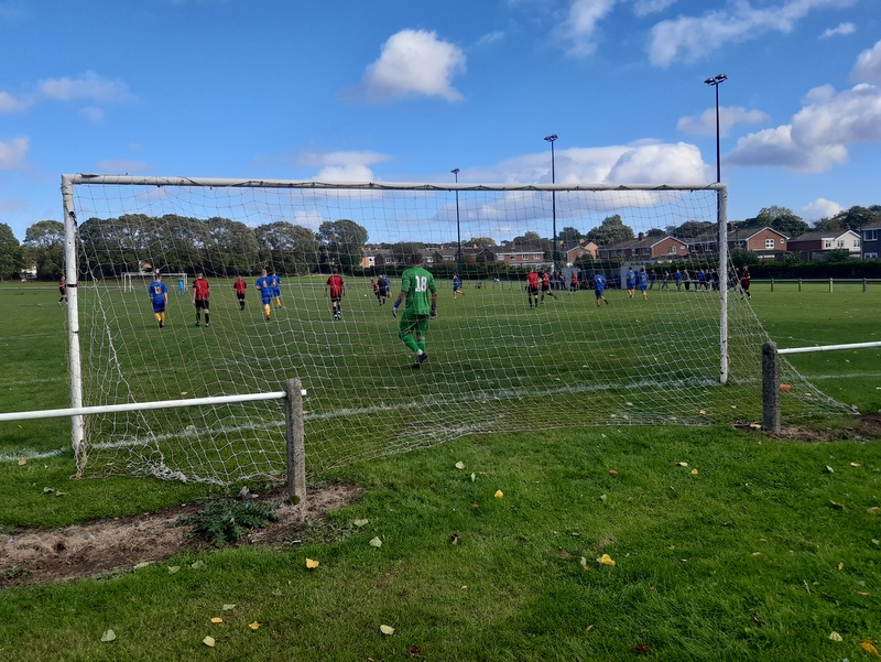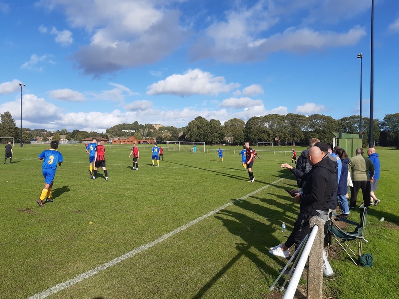Jen and I drove up to the pitch at Leyburn Road in Houghton-le-Spring. I’ve never been to Houghton before and noticed they have a castle of sorts. If I ‘d realized I’d have left an hour or so earlier and had a wander round. Although we had the dog with us, so that might have made things difficult. The pitch was a fair walk from the changies, so when we got to half-time the players just sat down on the grass.
