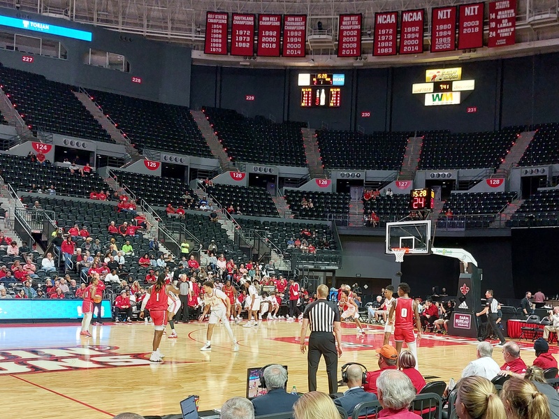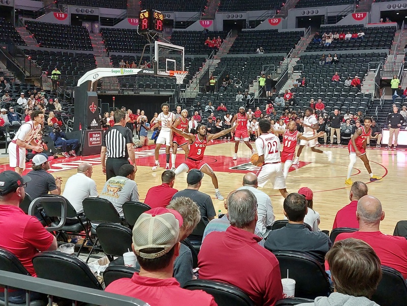 Despite free admission the attendance was low. Sparse enough to hear every waggish comment from the comedians around me. Youngstown had a tatty set of vests and one fella to my right spent the game shouting for “more glue” every time a number or the lettering began to peel off. The game ran for two twenty-minute halves rather than four quarters. I liked that, although I suppose it cuts down the opportunity for ad revenue.