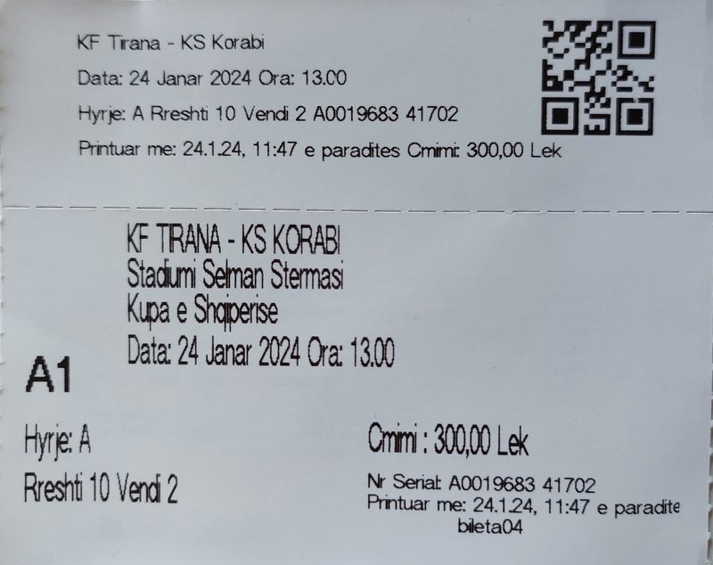 I got there early. Too early, as it happened, as the ticket office hadn’t opened. I killed a bit of time with some lasagne for lunch before returning to hand over three hundred Leks for a ticket in the main covered stand. That’s two and a half quid.