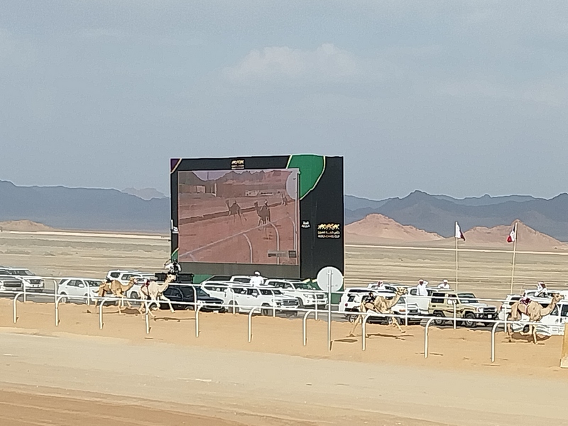 As much as I welcomed the air-conditioning, I like watching my racing in the open air and so we headed outside once the action started. There were four races, all between six and eight kilometres in distance and on a single lap course. That meant that we only saw the camels as they approached the finishing line. The rest of the time we followed their progress on a big screen as they made their way through the distant countryside.