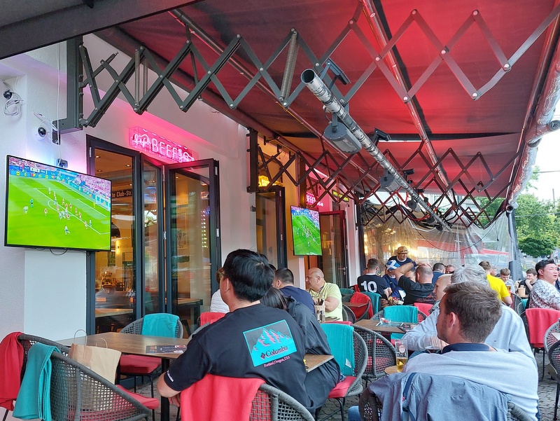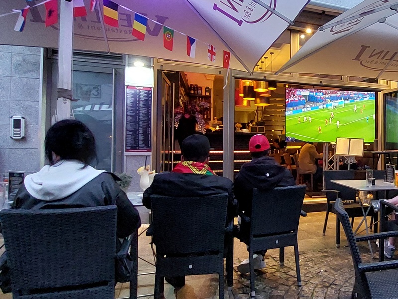 For the nine o’clock game we sought a change of scenery and headed a hundred yards or so up the road to an area with a few bars that had tables outside. It was still raining but we found somewhere with large umbrellas and settled in for Portugal’s game against Czechia. I must have missed their change of name from when they were the Czech Republic. Perhaps they’ve installed a monarchy when I wasn’t looking.