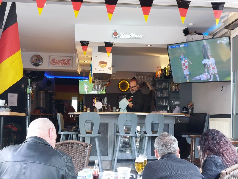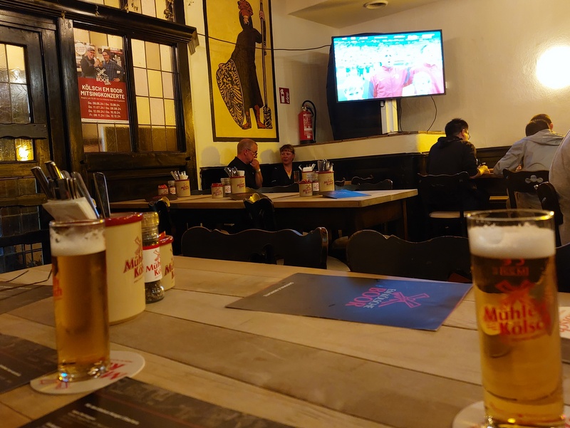 This was one of the fixtures that I’d tried to get tickets for, but when we saw the torrential rain inside the stadium at Dortmund, I was glad that we were sat inside a bar eating pork knuckle with mash and sauerkraut, washed down with ongoing servings of the local Kolsch beer. When you’ve drained your 200ml glass, the barman just appears with a fresh one and then marks a beer mat to keep a running total. Perfect.