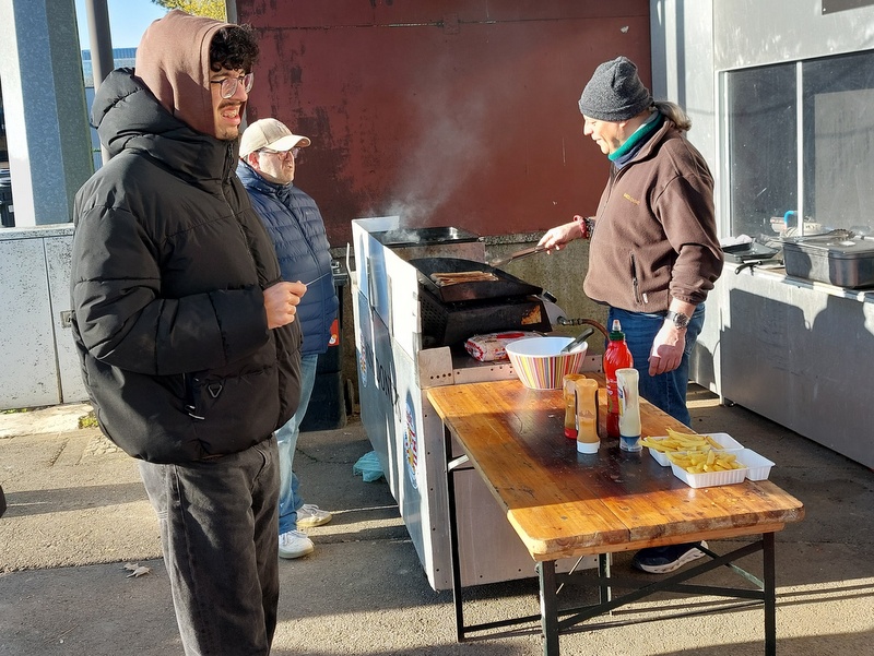 At half-time I wandered over to where a fella was grilling burgers and sausages. He directed me back to the cabin that I’d been to earlier to buy a ticket and explained to me what to ask for. I ended up with German sausage in a French baguette. Best of both worlds really.