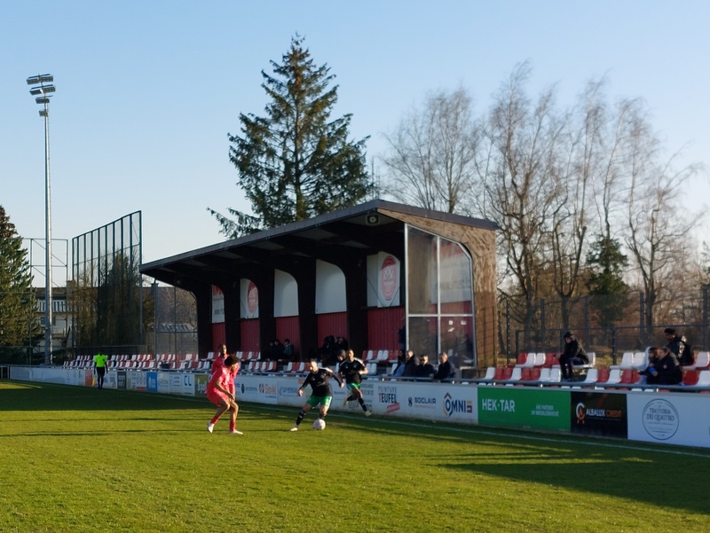 Luxembourg-Cents has a two thousand, eight-hundred capacity. There’s seating all down one side with a central covered section. I liked that the sides of that stand were clear plastic, so you got protection from the wind, but also were able to see the action when it was taking place by either of the near-side corner flags.