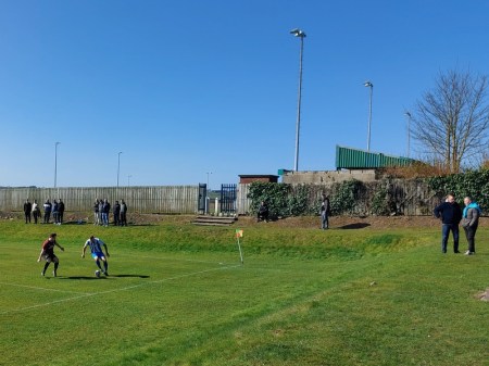 Easington were in blue and white with Shotton in a maroon and black kit. There were around thirty spectators, mainly older blokes, perhaps keen to get out of the house. A couple of WAGs sat on the grass near to the Shotton subs and coaches and there were a few younger blokes on the far side who had already cracked open the lager cans.
