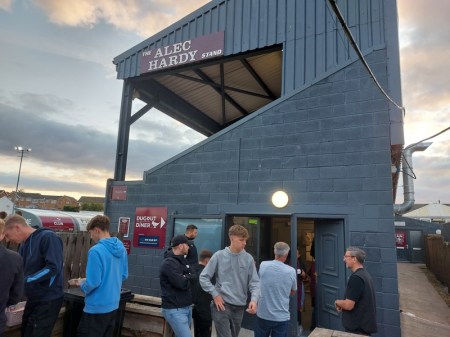 Next to the main stand was a cabin with a rooftop viewing area. This was where the people who had opted for the thirty pounds hospitality package watched the game from. The stands behind the goal looked as if they had all been erected at different times with little regard to an overall design. I liked the look of it though, it was a sort of shanty town.