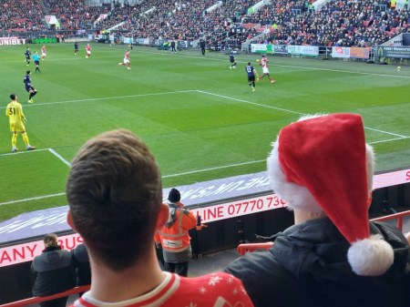 There seemed to have been a lot of development at Ashton Gate since 2009 with at least two new stands. We might even have been at the opposite end to last time. I was in row eleven, but the first eight or nine rows were covered over. As my row was the last of the lower tier, I had a bar to lean back against.