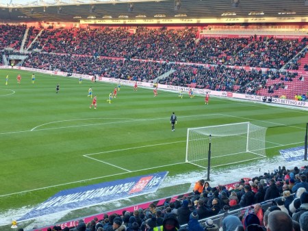 It was no warmer walking to the Riverside, but as ever, there was someone wearing shorts. Harry suspected that he must be a postman and that may very well be the case. We met Tom and Murgy at the fanzone where there were far fewer people than there usually are. We were served in seconds, whereas there is normally a lengthy queue. Maybe the club need to move into the mulled wine market rather than relying on ice-cold Carling.