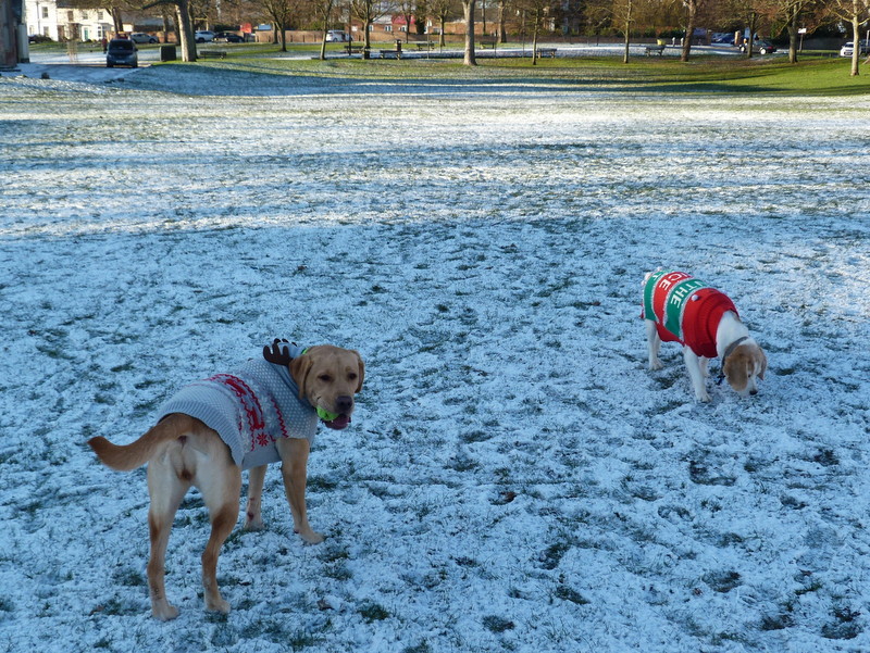 The dogs don’t mind the snow though and Jen and I walked them to The Green so that the labrador could chase a tennis ball whilst the beagle pottered around. Despite his age, Henry still hasn’t grasped the idea of returning the ball for it to be thrown again and if he does manage to get hold of it will just walk around with it in his mouth. Millie will retrieve and return the ball all day long.