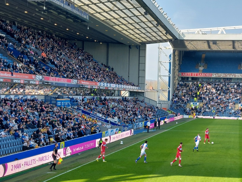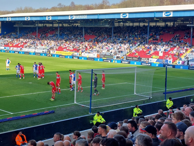Ewood Park was a thirty minute drive away. I got there a little too late for parking close to the ground, but managed to find somewhere around fifteen minute’s walk away. There were long queues for the upper tier, but fortunately I was downstairs and was virtually straight in. Once inside I stood in line much longer for a drink and a hot dog.
