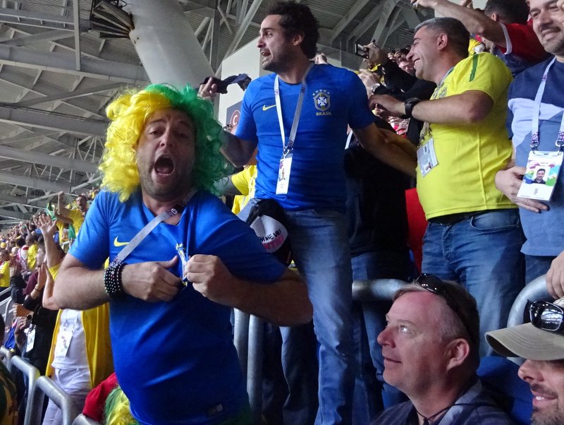 The lack of segregation made for an unusual atmosphere. We had Costa Ricans in the row behind us, with Brazilians to the right and left. These fans ignored each other and took the safer option of taunting rivals ten or twenty yards away instead. The Brazilians struck me as being quite arrogant, frequently pointing to the stars on their shirts or holding up five fingers and a clenched fist to highlight the difference in the historical achievements of the two sides.